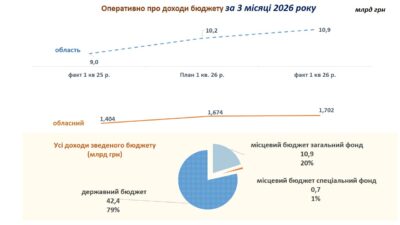 У першому кварталі до загального фонду місцевих бюджетів Львівщини надійшло 10,9 млрд грн податків і платежів, що дозволило перевиконати планові завдання на 678 млн грн або 6,6 відсотка.