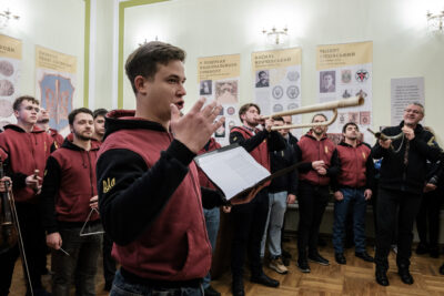 З різдвяною колядою сьогодні, 31 грудня, до Львівської обласної ради та Львівської обласної державної адміністрації завітала Національна чоловіча хорова капела «Дударик».
