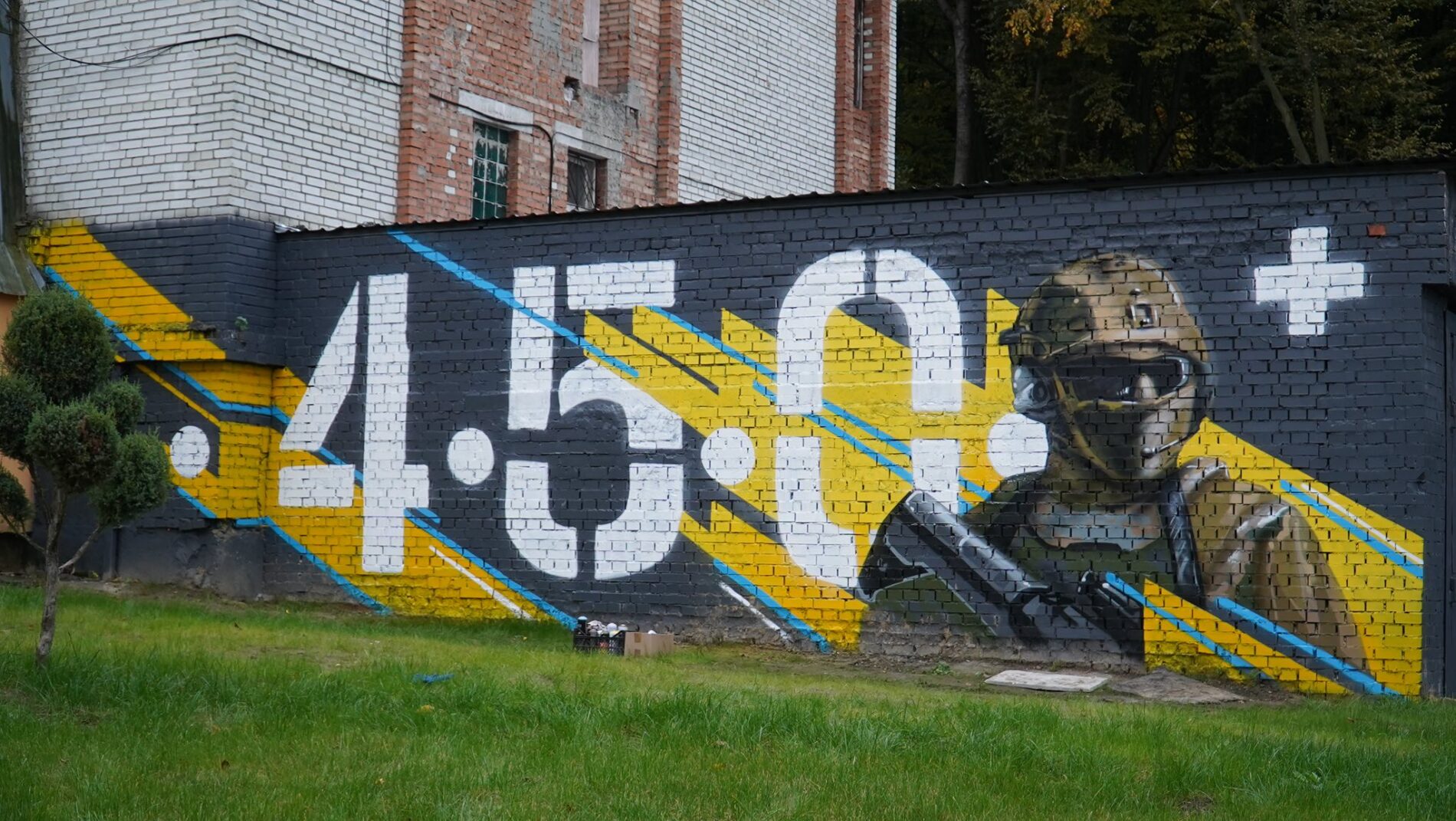 На території комунального закладу Львівської обласної ради «Львівський ліцей з посиленою військово-фізичною підготовкою імені Героїв Крут» з’явилося нове графіті з зображенням сучасного українського воїна. Поруч – напис «4.5.0», який означає «все спокійно» або ж «все добре».