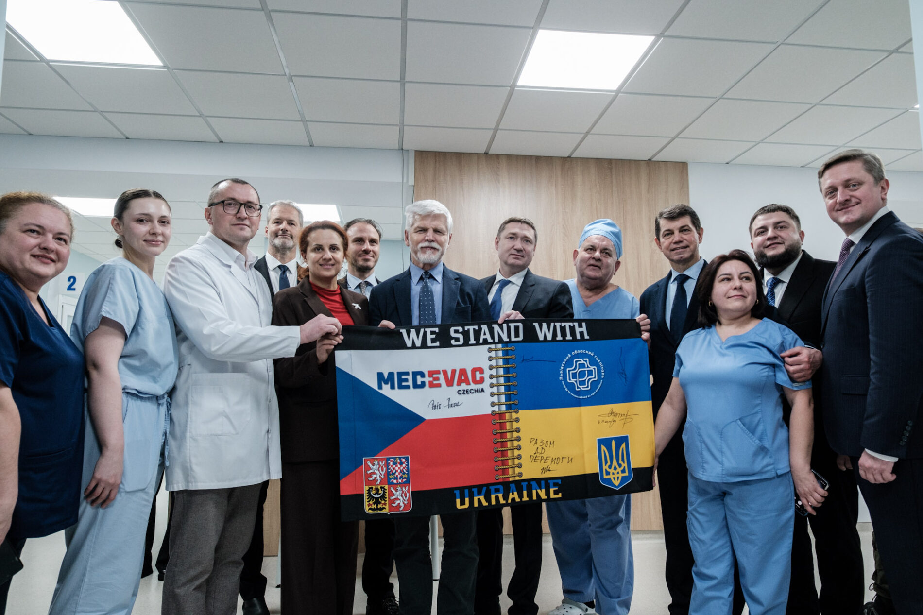 Спільно чеські гості, урядовці, представники обласної влади та медики підписали прапори місії MEDEVAC: один із них передали Президенту Чехії, інший залишили в госпіталі як символ партнерства та пам’ять про візит високого гостя.